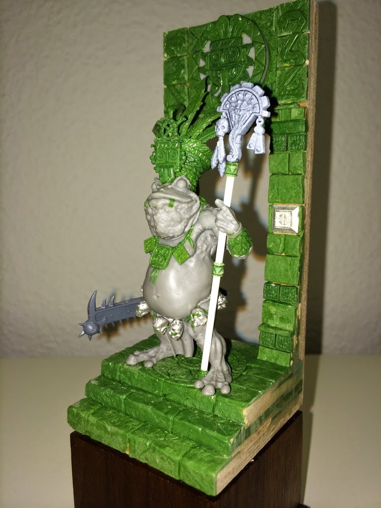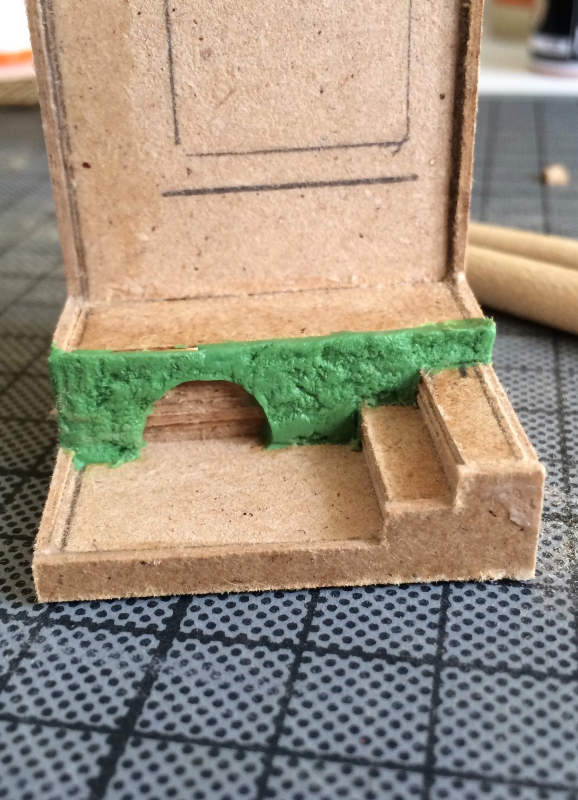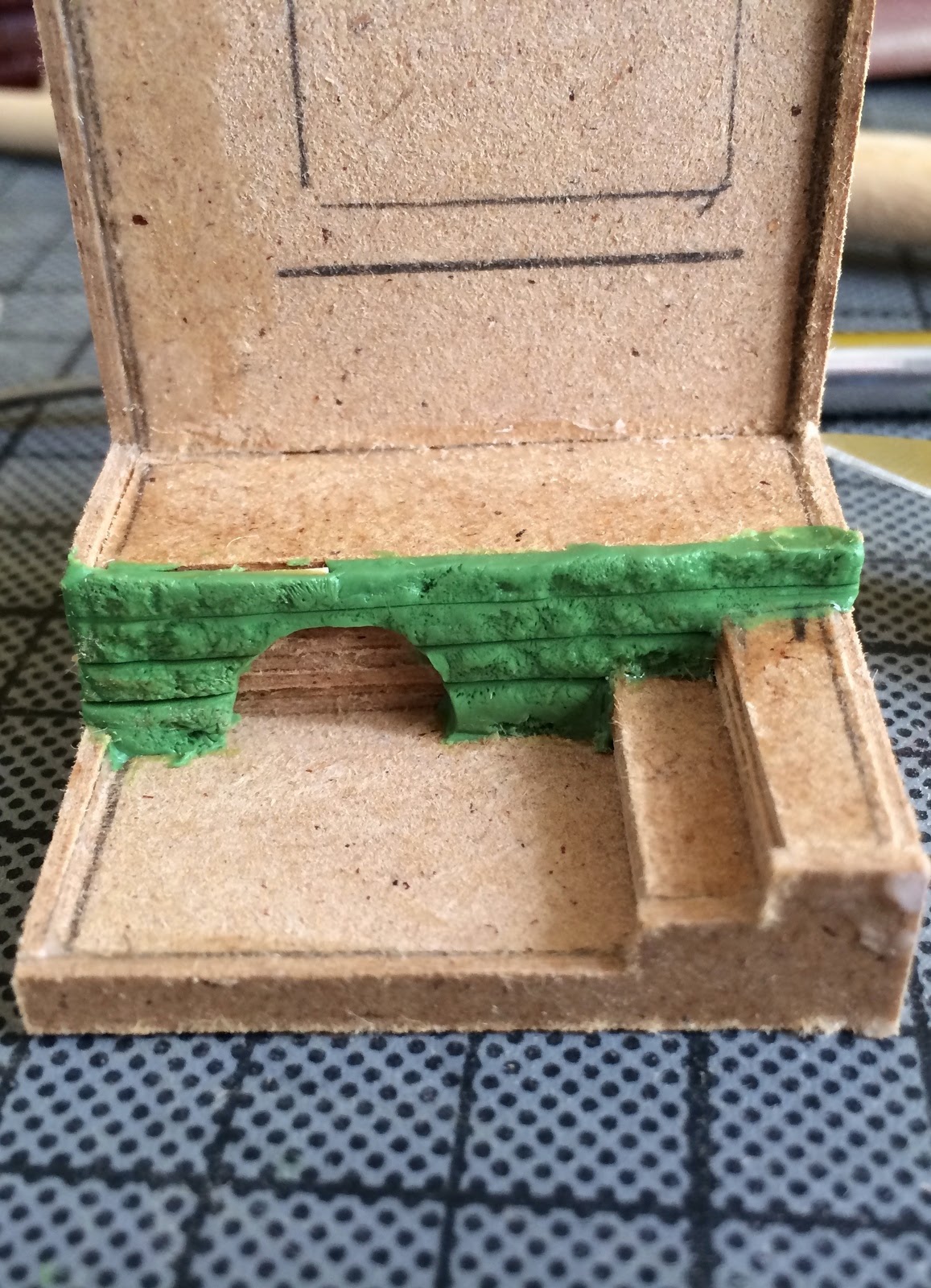 Now it is time to start with the stone-structures on the building. I started with a consistent layer of greenstuff on the front of the socket. Now i used old cut-down IKEA-brushes to add structure. Those brushes have very stiff plastic bristles, which means they are horrible for painting, but they can create nice natural textures.