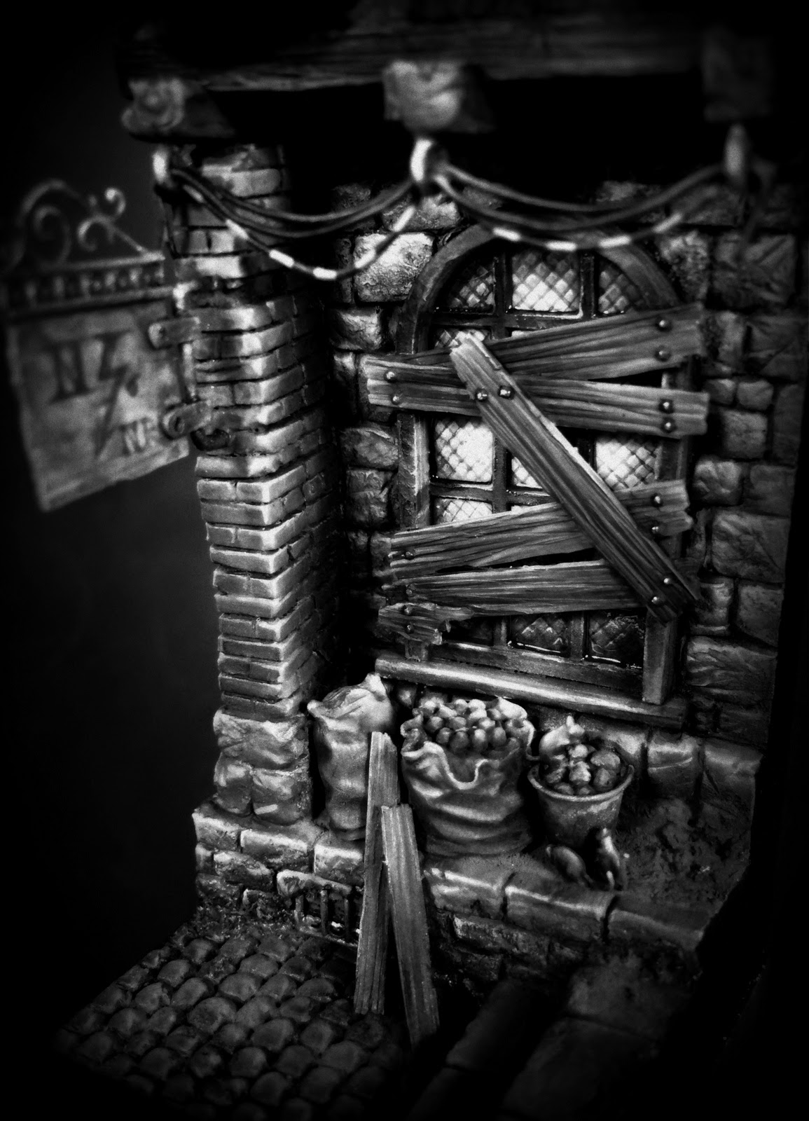 Meine definition von Steampunk ist dabei relativ einfach ... Dampf, Rohre und Zahnräder. Das Bild, welches ich hier im Kopf habe ist teil eines 2-geschossigen Gebäudes, ähnlich dem Hintergrund aus dem Diorama "Kansas und die Bauchtänzerin" von Romeo Models, natürlich mit einem ordentlichen viktorianischen Einschlag. Hier mal ein Bild nach etwa 30 Minuten Arbeit: